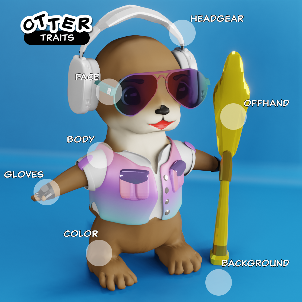 每個Otter NFT都由八個特徵組成：帽子、臉飾、手套、皮膚、衣服、手持物、背景和降落地點。特徵除了降落地點外都有一系列不同的造型和風格。